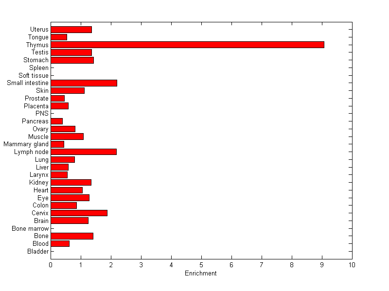 The expression level is normalized with tissue-library size. Each value for a gene in a tissue is a ratio of observed ESTs to the expected one in this tissue. The expected number of ESTs is the product of total ESTs of the gene and the fraction of total ESTs in the tissue among all ESTs in 30 tissues.