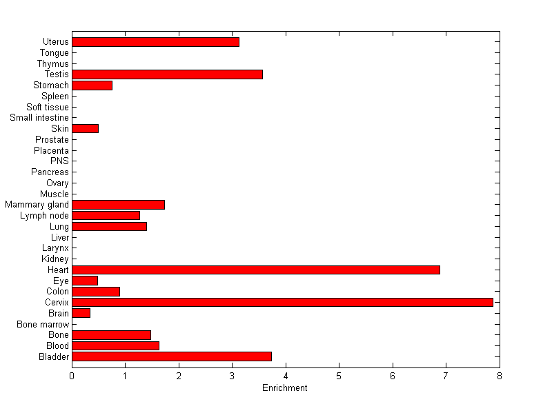 The expression level is normalized with tissue-library size. Each value for a gene in a tissue is a ratio of observed ESTs to the expected one in this tissue. The expected number of ESTs is the product of total ESTs of the gene and the fraction of total ESTs in the tissue among all ESTs in 30 tissues.