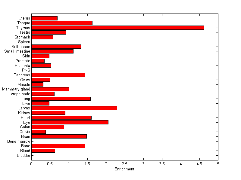 The expression level is normalized with tissue-library size. Each value for a gene in a tissue is a ratio of observed ESTs to the expected one in this tissue. The expected number of ESTs is the product of total ESTs of the gene and the fraction of total ESTs in the tissue among all ESTs in 30 tissues.