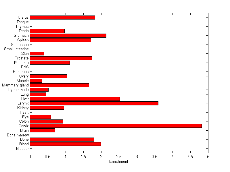 The expression level is normalized with tissue-library size. Each value for a gene in a tissue is a ratio of observed ESTs to the expected one in this tissue. The expected number of ESTs is the product of total ESTs of the gene and the fraction of total ESTs in the tissue among all ESTs in 30 tissues.