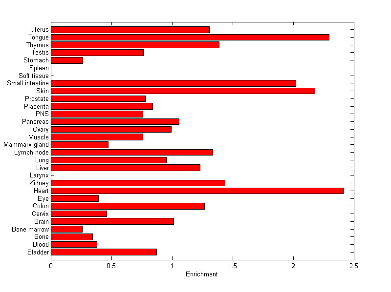 The expression level is normalized with tissue-library size. Each value for a gene in a tissue is a ratio of observed ESTs to the expected one in this tissue. The expected number of ESTs is the product of total ESTs of the gene and the fraction of total ESTs in the tissue among all ESTs in 30 tissues.