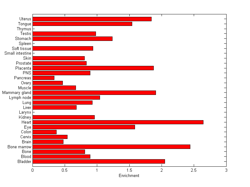 The expression level is normalized with tissue-library size. Each value for a gene in a tissue is a ratio of observed ESTs to the expected one in this tissue. The expected number of ESTs is the product of total ESTs of the gene and the fraction of total ESTs in the tissue among all ESTs in 30 tissues.