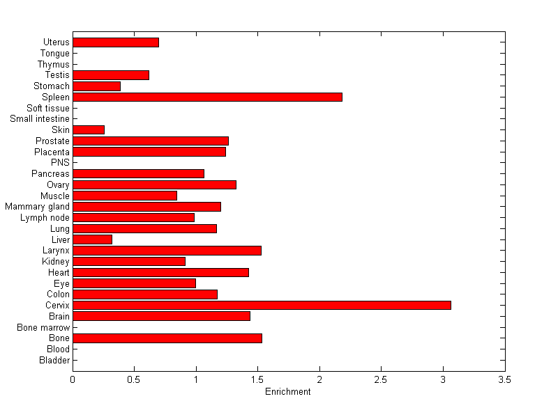 The expression level is normalized with tissue-library size. Each value for a gene in a tissue is a ratio of observed ESTs to the expected one in this tissue. The expected number of ESTs is the product of total ESTs of the gene and the fraction of total ESTs in the tissue among all ESTs in 30 tissues.