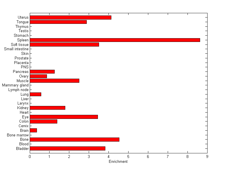 The expression level is normalized with tissue-library size. Each value for a gene in a tissue is a ratio of observed ESTs to the expected one in this tissue. The expected number of ESTs is the product of total ESTs of the gene and the fraction of total ESTs in the tissue among all ESTs in 30 tissues.