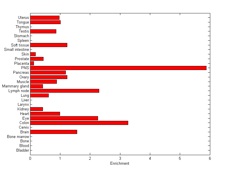 The expression level is normalized with tissue-library size. Each value for a gene in a tissue is a ratio of observed ESTs to the expected one in this tissue. The expected number of ESTs is the product of total ESTs of the gene and the fraction of total ESTs in the tissue among all ESTs in 30 tissues.