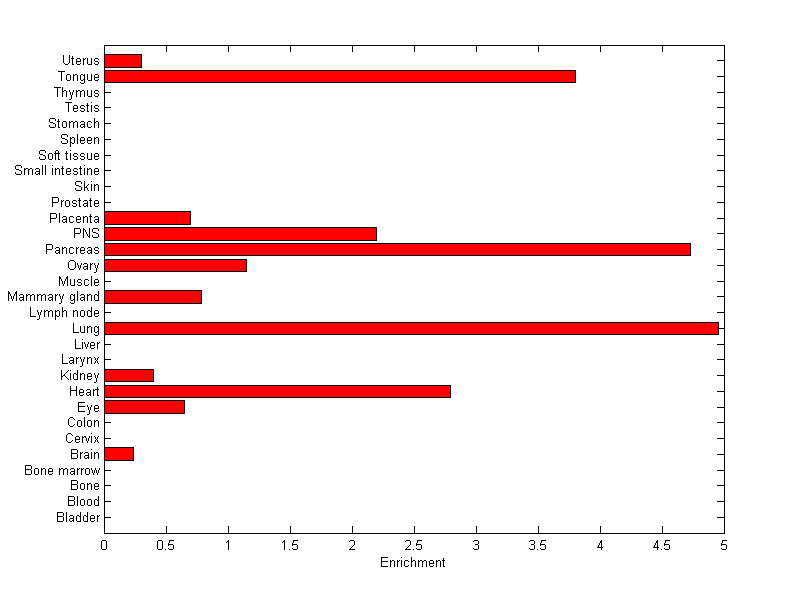 The expression level is normalized with tissue-library size. Each value for a gene in a tissue is a ratio of observed ESTs to the expected one in this tissue. The expected number of ESTs is the product of total ESTs of the gene and the fraction of total ESTs in the tissue among all ESTs in 30 tissues.