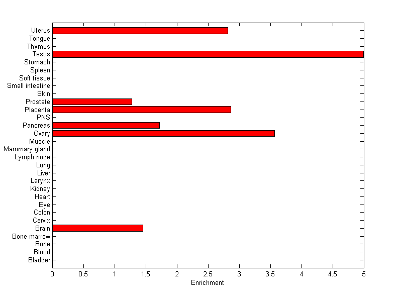 The expression level is normalized with tissue-library size. Each value for a gene in a tissue is a ratio of observed ESTs to the expected one in this tissue. The expected number of ESTs is the product of total ESTs of the gene and the fraction of total ESTs in the tissue among all ESTs in 30 tissues.