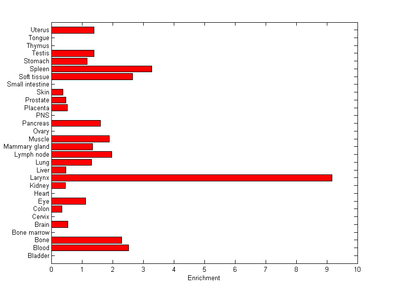 The expression level is normalized with tissue-library size. Each value for a gene in a tissue is a ratio of observed ESTs to the expected one in this tissue. The expected number of ESTs is the product of total ESTs of the gene and the fraction of total ESTs in the tissue among all ESTs in 30 tissues.