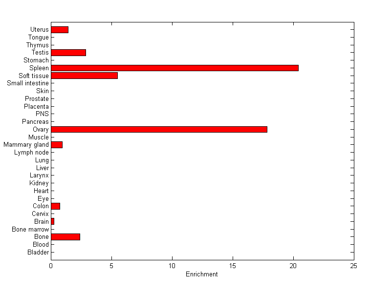 The expression level is normalized with tissue-library size. Each value for a gene in a tissue is a ratio of observed ESTs to the expected one in this tissue. The expected number of ESTs is the product of total ESTs of the gene and the fraction of total ESTs in the tissue among all ESTs in 30 tissues.