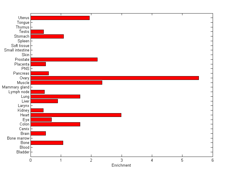 The expression level is normalized with tissue-library size. Each value for a gene in a tissue is a ratio of observed ESTs to the expected one in this tissue. The expected number of ESTs is the product of total ESTs of the gene and the fraction of total ESTs in the tissue among all ESTs in 30 tissues.