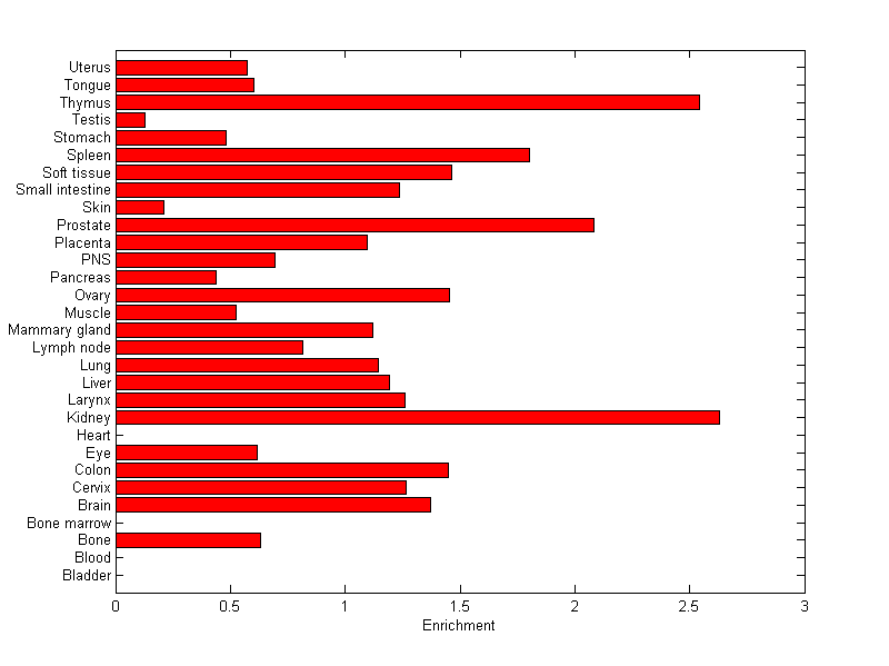 The expression level is normalized with tissue-library size. Each value for a gene in a tissue is a ratio of observed ESTs to the expected one in this tissue. The expected number of ESTs is the product of total ESTs of the gene and the fraction of total ESTs in the tissue among all ESTs in 30 tissues.