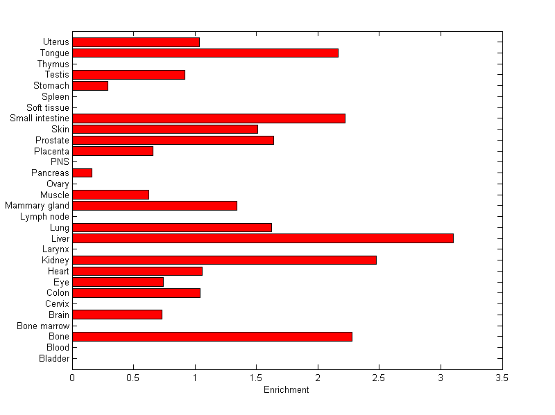 The expression level is normalized with tissue-library size. Each value for a gene in a tissue is a ratio of observed ESTs to the expected one in this tissue. The expected number of ESTs is the product of total ESTs of the gene and the fraction of total ESTs in the tissue among all ESTs in 30 tissues.