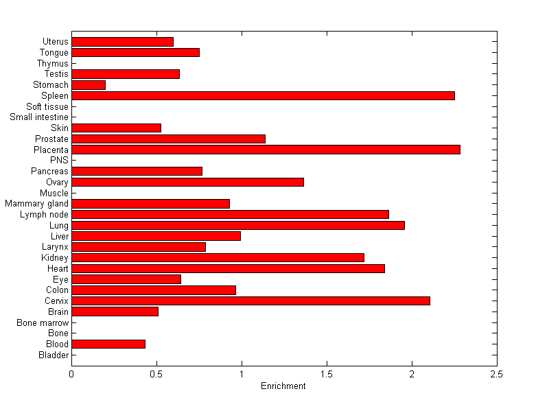 The expression level is normalized with tissue-library size. Each value for a gene in a tissue is a ratio of observed ESTs to the expected one in this tissue. The expected number of ESTs is the product of total ESTs of the gene and the fraction of total ESTs in the tissue among all ESTs in 30 tissues.