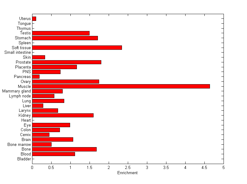 The expression level is normalized with tissue-library size. Each value for a gene in a tissue is a ratio of observed ESTs to the expected one in this tissue. The expected number of ESTs is the product of total ESTs of the gene and the fraction of total ESTs in the tissue among all ESTs in 30 tissues.