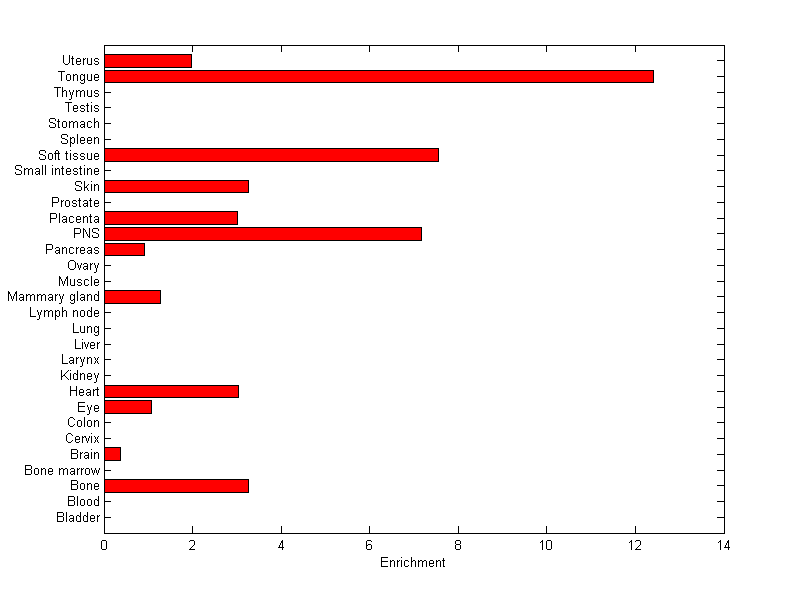 The expression level is normalized with tissue-library size. Each value for a gene in a tissue is a ratio of observed ESTs to the expected one in this tissue. The expected number of ESTs is the product of total ESTs of the gene and the fraction of total ESTs in the tissue among all ESTs in 30 tissues.