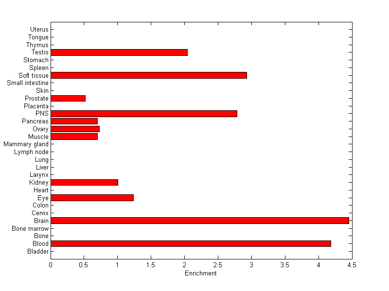 The expression level is normalized with tissue-library size. Each value for a gene in a tissue is a ratio of observed ESTs to the expected one in this tissue. The expected number of ESTs is the product of total ESTs of the gene and the fraction of total ESTs in the tissue among all ESTs in 30 tissues.