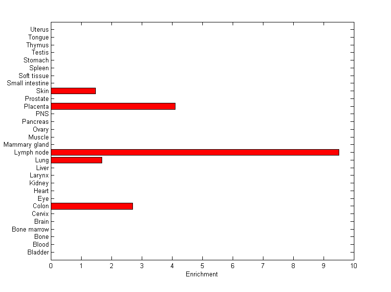 The expression level is normalized with tissue-library size. Each value for a gene in a tissue is a ratio of observed ESTs to the expected one in this tissue. The expected number of ESTs is the product of total ESTs of the gene and the fraction of total ESTs in the tissue among all ESTs in 30 tissues.