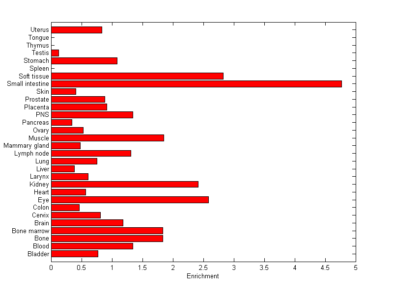 The expression level is normalized with tissue-library size. Each value for a gene in a tissue is a ratio of observed ESTs to the expected one in this tissue. The expected number of ESTs is the product of total ESTs of the gene and the fraction of total ESTs in the tissue among all ESTs in 30 tissues.