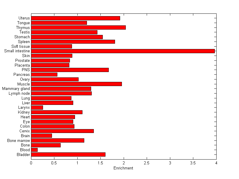 The expression level is normalized with tissue-library size. Each value for a gene in a tissue is a ratio of observed ESTs to the expected one in this tissue. The expected number of ESTs is the product of total ESTs of the gene and the fraction of total ESTs in the tissue among all ESTs in 30 tissues.