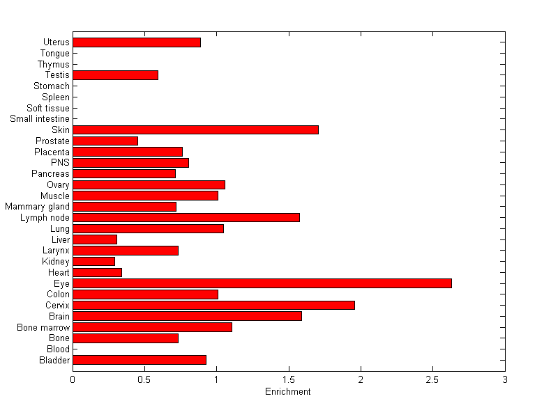 The expression level is normalized with tissue-library size. Each value for a gene in a tissue is a ratio of observed ESTs to the expected one in this tissue. The expected number of ESTs is the product of total ESTs of the gene and the fraction of total ESTs in the tissue among all ESTs in 30 tissues.