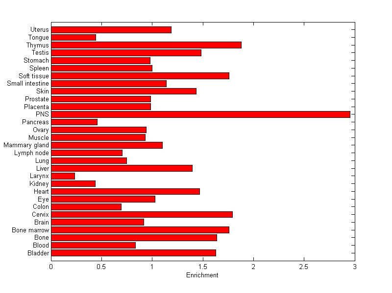 The expression level is normalized with tissue-library size. Each value for a gene in a tissue is a ratio of observed ESTs to the expected one in this tissue. The expected number of ESTs is the product of total ESTs of the gene and the fraction of total ESTs in the tissue among all ESTs in 30 tissues.