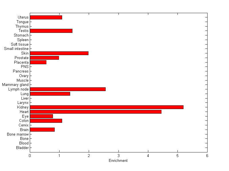 The expression level is normalized with tissue-library size. Each value for a gene in a tissue is a ratio of observed ESTs to the expected one in this tissue. The expected number of ESTs is the product of total ESTs of the gene and the fraction of total ESTs in the tissue among all ESTs in 30 tissues.
