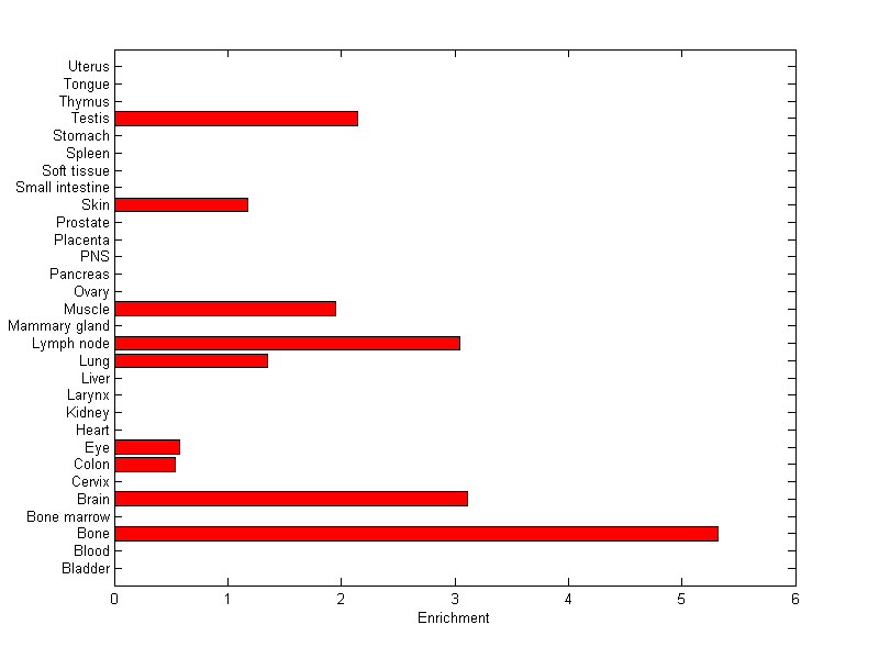 The expression level is normalized with tissue-library size. Each value for a gene in a tissue is a ratio of observed ESTs to the expected one in this tissue. The expected number of ESTs is the product of total ESTs of the gene and the fraction of total ESTs in the tissue among all ESTs in 30 tissues.