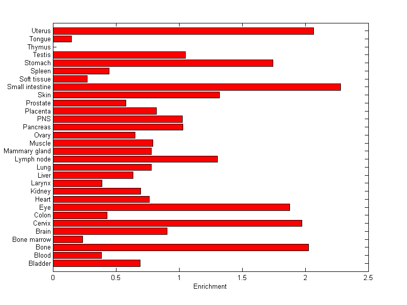 The expression level is normalized with tissue-library size. Each value for a gene in a tissue is a ratio of observed ESTs to the expected one in this tissue. The expected number of ESTs is the product of total ESTs of the gene and the fraction of total ESTs in the tissue among all ESTs in 30 tissues.