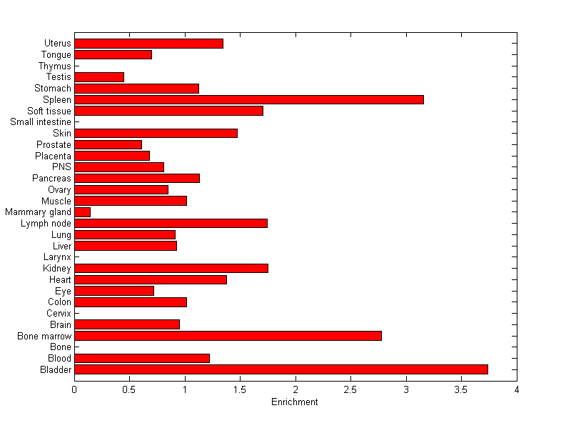 The expression level is normalized with tissue-library size. Each value for a gene in a tissue is a ratio of observed ESTs to the expected one in this tissue. The expected number of ESTs is the product of total ESTs of the gene and the fraction of total ESTs in the tissue among all ESTs in 30 tissues.
