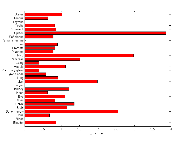 The expression level is normalized with tissue-library size. Each value for a gene in a tissue is a ratio of observed ESTs to the expected one in this tissue. The expected number of ESTs is the product of total ESTs of the gene and the fraction of total ESTs in the tissue among all ESTs in 30 tissues.