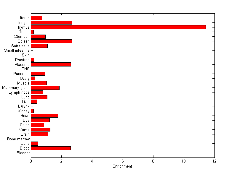The expression level is normalized with tissue-library size. Each value for a gene in a tissue is a ratio of observed ESTs to the expected one in this tissue. The expected number of ESTs is the product of total ESTs of the gene and the fraction of total ESTs in the tissue among all ESTs in 30 tissues.