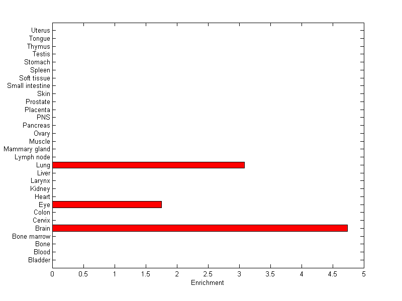 The expression level is normalized with tissue-library size. Each value for a gene in a tissue is a ratio of observed ESTs to the expected one in this tissue. The expected number of ESTs is the product of total ESTs of the gene and the fraction of total ESTs in the tissue among all ESTs in 30 tissues.
