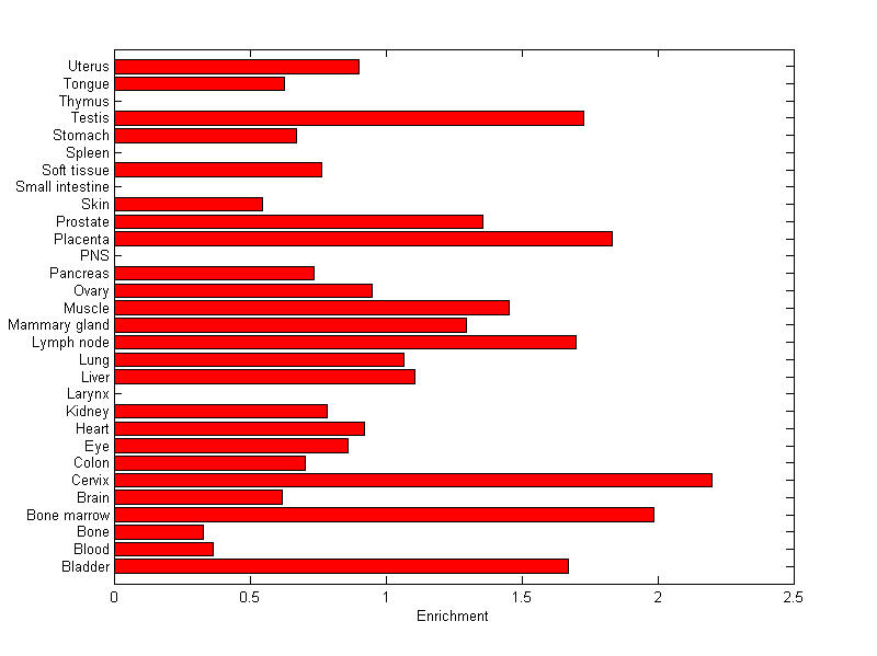 The expression level is normalized with tissue-library size. Each value for a gene in a tissue is a ratio of observed ESTs to the expected one in this tissue. The expected number of ESTs is the product of total ESTs of the gene and the fraction of total ESTs in the tissue among all ESTs in 30 tissues.