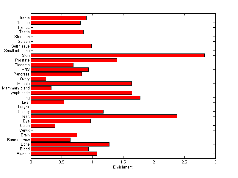 The expression level is normalized with tissue-library size. Each value for a gene in a tissue is a ratio of observed ESTs to the expected one in this tissue. The expected number of ESTs is the product of total ESTs of the gene and the fraction of total ESTs in the tissue among all ESTs in 30 tissues.