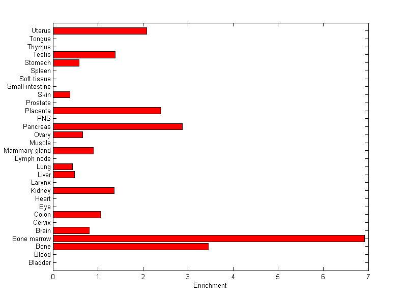 The expression level is normalized with tissue-library size. Each value for a gene in a tissue is a ratio of observed ESTs to the expected one in this tissue. The expected number of ESTs is the product of total ESTs of the gene and the fraction of total ESTs in the tissue among all ESTs in 30 tissues.