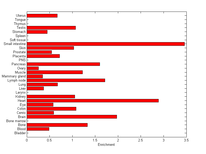 The expression level is normalized with tissue-library size. Each value for a gene in a tissue is a ratio of observed ESTs to the expected one in this tissue. The expected number of ESTs is the product of total ESTs of the gene and the fraction of total ESTs in the tissue among all ESTs in 30 tissues.