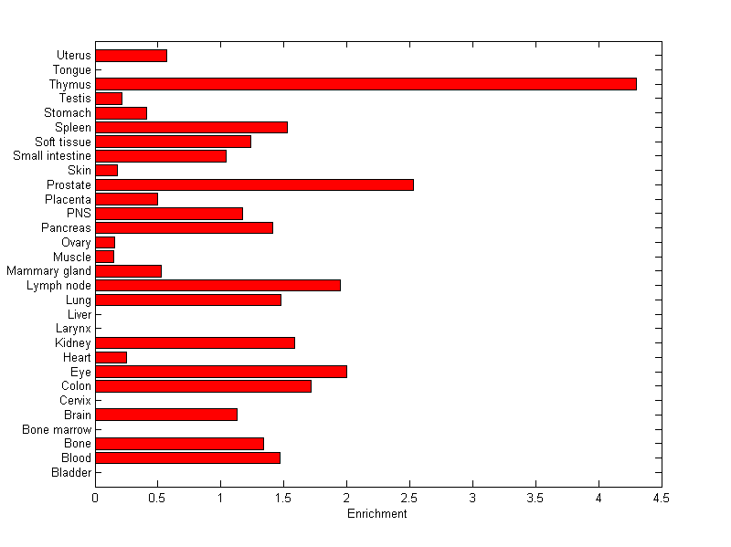 The expression level is normalized with tissue-library size. Each value for a gene in a tissue is a ratio of observed ESTs to the expected one in this tissue. The expected number of ESTs is the product of total ESTs of the gene and the fraction of total ESTs in the tissue among all ESTs in 30 tissues.