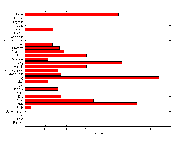 The expression level is normalized with tissue-library size. Each value for a gene in a tissue is a ratio of observed ESTs to the expected one in this tissue. The expected number of ESTs is the product of total ESTs of the gene and the fraction of total ESTs in the tissue among all ESTs in 30 tissues.
