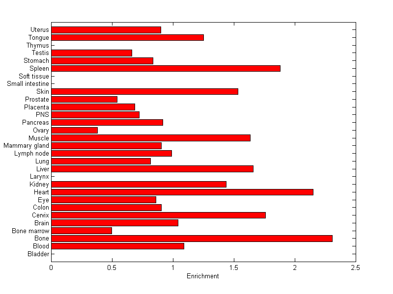 The expression level is normalized with tissue-library size. Each value for a gene in a tissue is a ratio of observed ESTs to the expected one in this tissue. The expected number of ESTs is the product of total ESTs of the gene and the fraction of total ESTs in the tissue among all ESTs in 30 tissues.