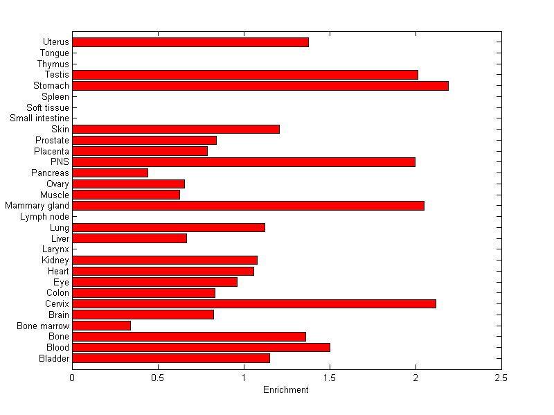 The expression level is normalized with tissue-library size. Each value for a gene in a tissue is a ratio of observed ESTs to the expected one in this tissue. The expected number of ESTs is the product of total ESTs of the gene and the fraction of total ESTs in the tissue among all ESTs in 30 tissues.
