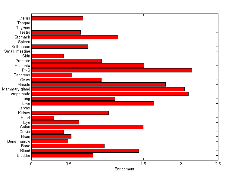 The expression level is normalized with tissue-library size. Each value for a gene in a tissue is a ratio of observed ESTs to the expected one in this tissue. The expected number of ESTs is the product of total ESTs of the gene and the fraction of total ESTs in the tissue among all ESTs in 30 tissues.