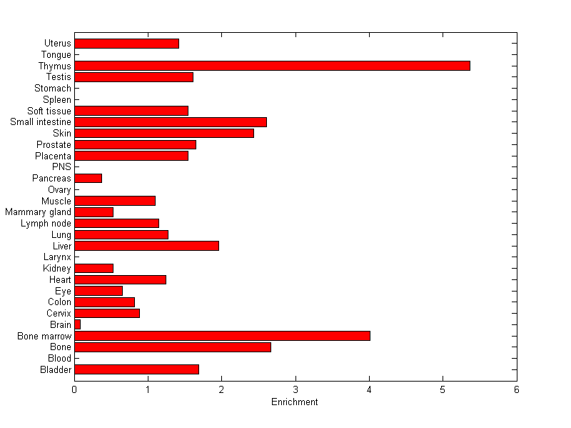 The expression level is normalized with tissue-library size. Each value for a gene in a tissue is a ratio of observed ESTs to the expected one in this tissue. The expected number of ESTs is the product of total ESTs of the gene and the fraction of total ESTs in the tissue among all ESTs in 30 tissues.