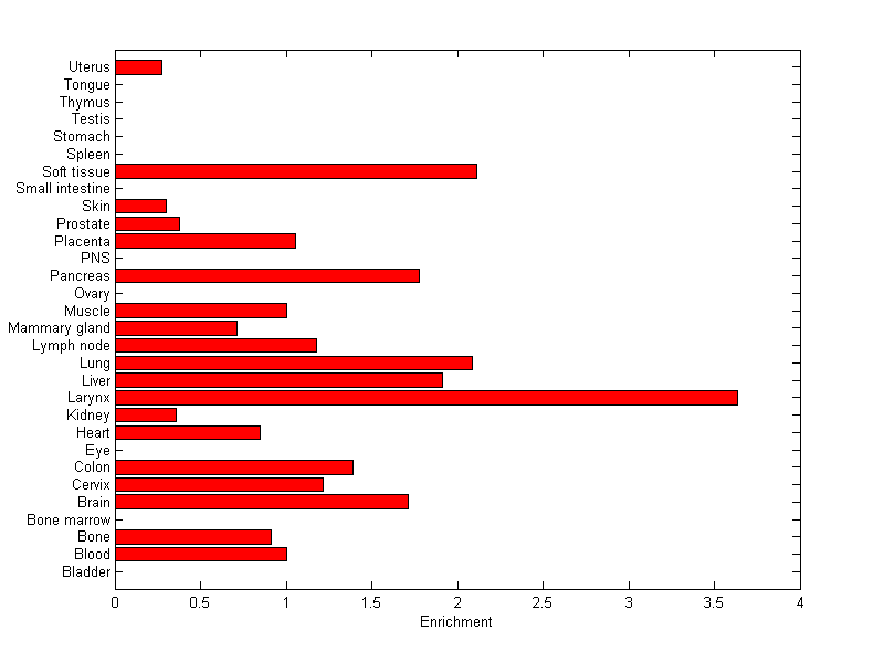 The expression level is normalized with tissue-library size. Each value for a gene in a tissue is a ratio of observed ESTs to the expected one in this tissue. The expected number of ESTs is the product of total ESTs of the gene and the fraction of total ESTs in the tissue among all ESTs in 30 tissues.
