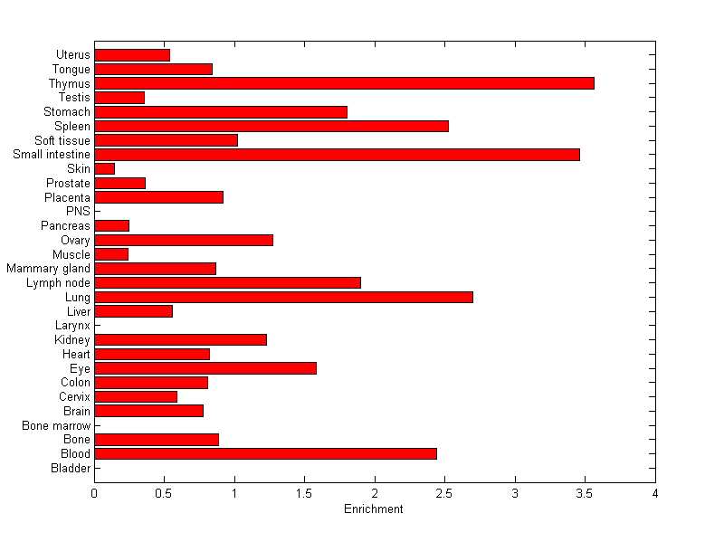 The expression level is normalized with tissue-library size. Each value for a gene in a tissue is a ratio of observed ESTs to the expected one in this tissue. The expected number of ESTs is the product of total ESTs of the gene and the fraction of total ESTs in the tissue among all ESTs in 30 tissues.