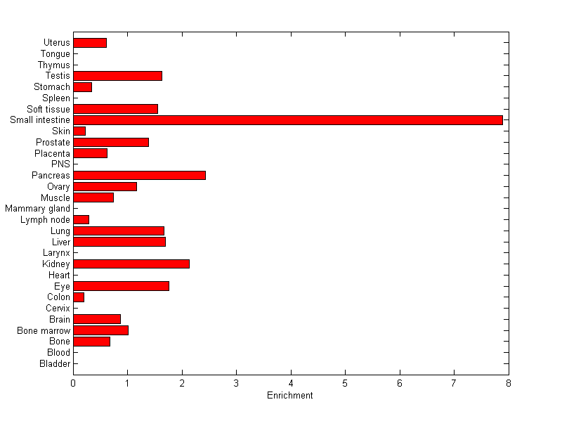 The expression level is normalized with tissue-library size. Each value for a gene in a tissue is a ratio of observed ESTs to the expected one in this tissue. The expected number of ESTs is the product of total ESTs of the gene and the fraction of total ESTs in the tissue among all ESTs in 30 tissues.