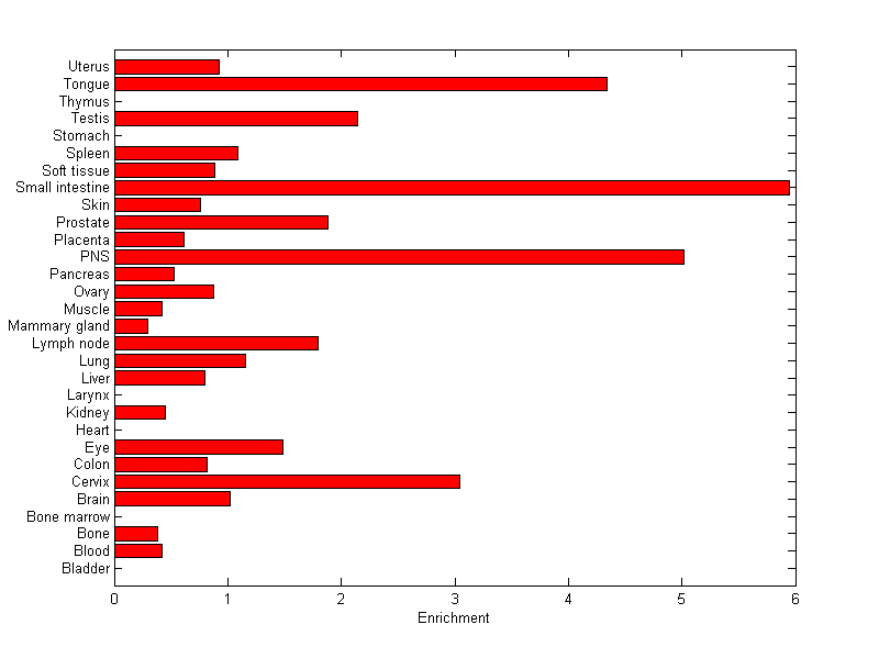 The expression level is normalized with tissue-library size. Each value for a gene in a tissue is a ratio of observed ESTs to the expected one in this tissue. The expected number of ESTs is the product of total ESTs of the gene and the fraction of total ESTs in the tissue among all ESTs in 30 tissues.