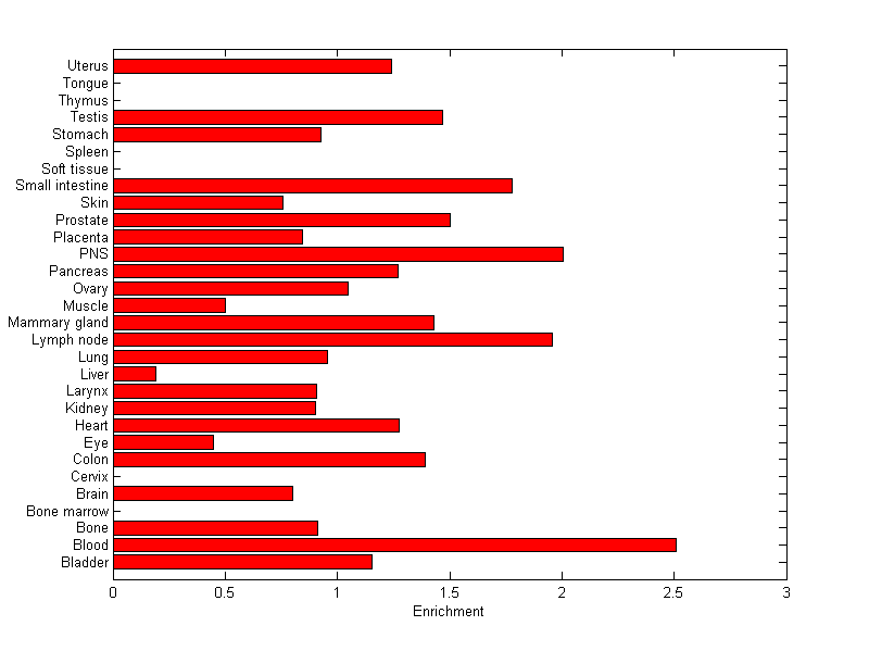 The expression level is normalized with tissue-library size. Each value for a gene in a tissue is a ratio of observed ESTs to the expected one in this tissue. The expected number of ESTs is the product of total ESTs of the gene and the fraction of total ESTs in the tissue among all ESTs in 30 tissues.