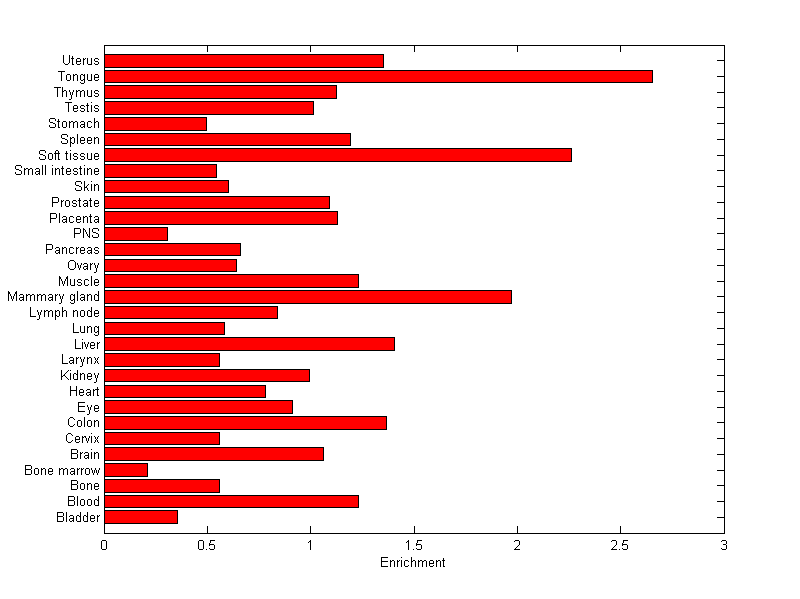 The expression level is normalized with tissue-library size. Each value for a gene in a tissue is a ratio of observed ESTs to the expected one in this tissue. The expected number of ESTs is the product of total ESTs of the gene and the fraction of total ESTs in the tissue among all ESTs in 30 tissues.