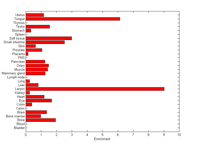 The expression level is normalized with tissue-library size. Each value for a gene in a tissue is a ratio of observed ESTs to the expected one in this tissue. The expected number of ESTs is the product of total ESTs of the gene and the fraction of total ESTs in the tissue among all ESTs in 30 tissues.