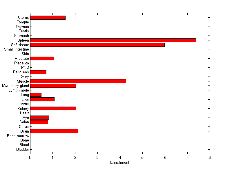 The expression level is normalized with tissue-library size. Each value for a gene in a tissue is a ratio of observed ESTs to the expected one in this tissue. The expected number of ESTs is the product of total ESTs of the gene and the fraction of total ESTs in the tissue among all ESTs in 30 tissues.